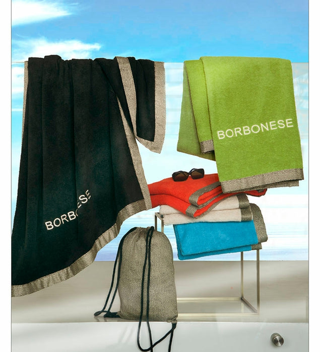 Telo mare con zainetto Borbonese, in 100% soffice spugna di cotone con bordatura Borbonese perimetrale h 5 cm. circa. Logo Borbonese ricamato in rilievo Dimensioni telo 100×180 Zainetto con telo dentro dimensioni 27×30 H 9.