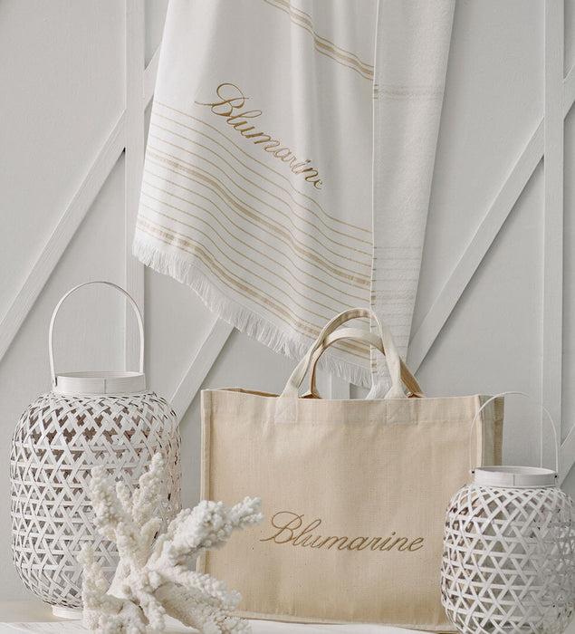 Telo mare tinta unita a multi-righe orizzontali tinto in filo in Lurex con logo Blumarine ricamato, fronte liscia e retro in micro-spugna riccio.Misure: 100x180 cmTessuto: 100% cotone idrofilo 300 g/mq