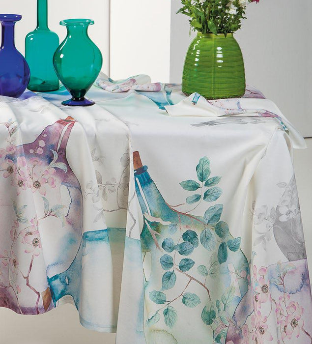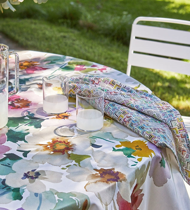 Tovaglia in tessuto riciclato 14% lino 86% Cotone Stampa digitale Macro disegni per la tovaglia e micro per i tovaglioli. Misura 150*180 + 6 tovaglioli Confezione scatola cartone riciclato. Nuova Collezione sostenibile