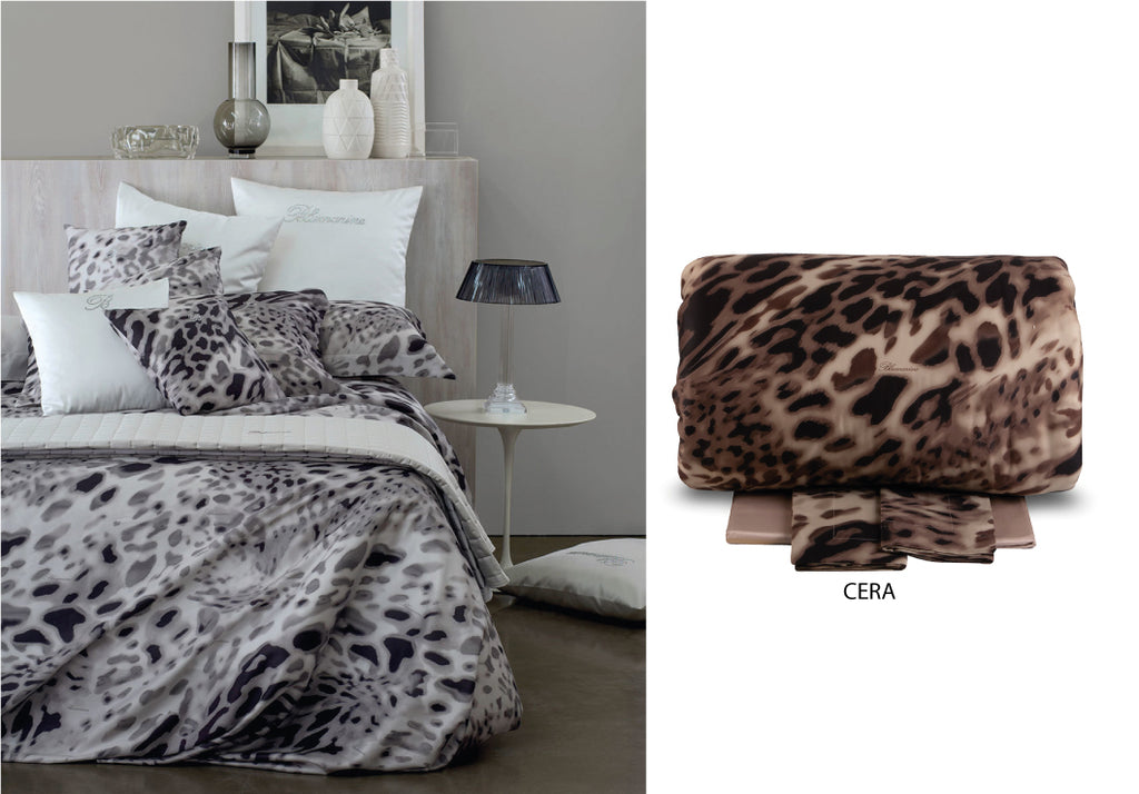 Completo copripiumino matrimoniale con stampa animalier all over su federe e sopra sacca copripiumino, lenzuolo sotto in raso di cotone tinta unita.Set 4 pezzi composto da:1 sacca copripiumino 250x200 cm2 federe a 3 volani 50x80...