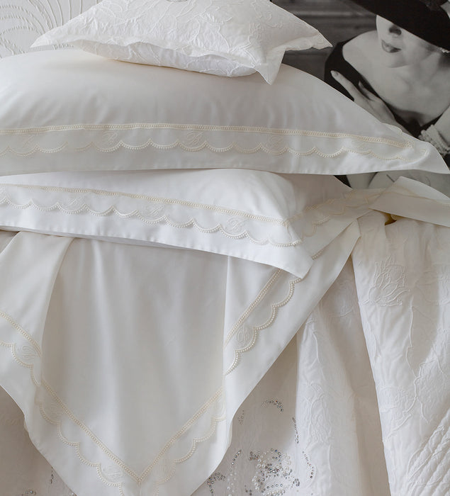 Raffinato ed elegante completo lenzuola matrimoniale con lista in macramè rimessa in applicazione, pizzo sulle federe a 3 volani e sul lenzuolo sopra, lenzuolo sotto teso in raso di cotone tinta unita. Set 4 pezzi...