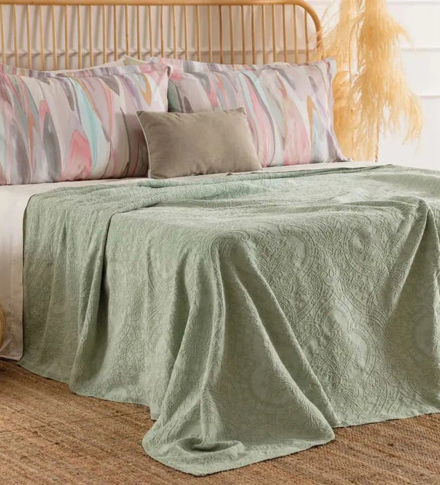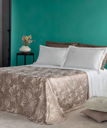 CCopriletto matrimoniale in tessuto jacquard esprime il fascino discreto della natura attraverso un disegno di foglie intrecciate che gioca con rilievi e profondità. Perfetto per le stagioni calde o per aggiungere un tocco di calore...