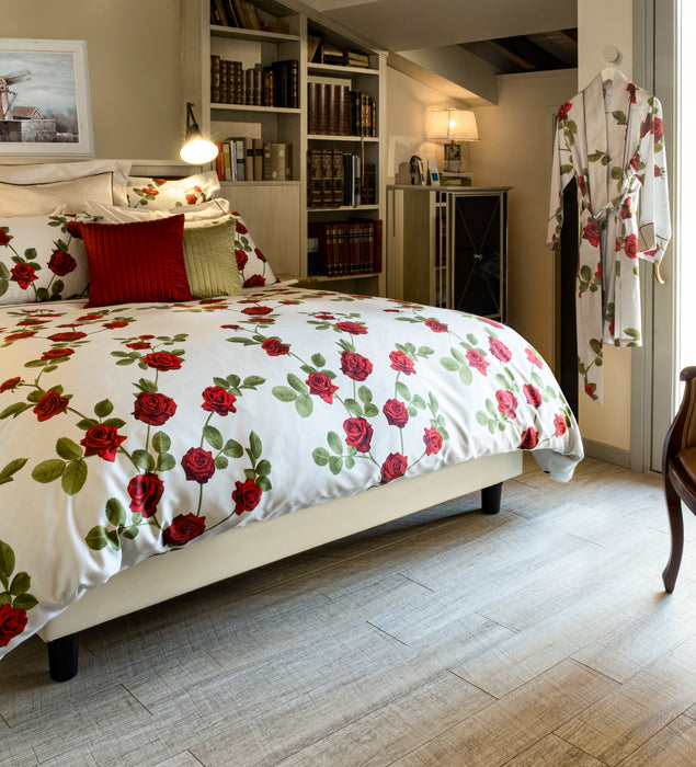 Parure copripiumino matrimoniale Signoria di Firenze stampa all over. Si narra che le prime rose Tea siano arrivate su navi della Compagnia delle Indie Orientali, dedicate principalmente al trasporto del tè. Poiché una piccola parte...