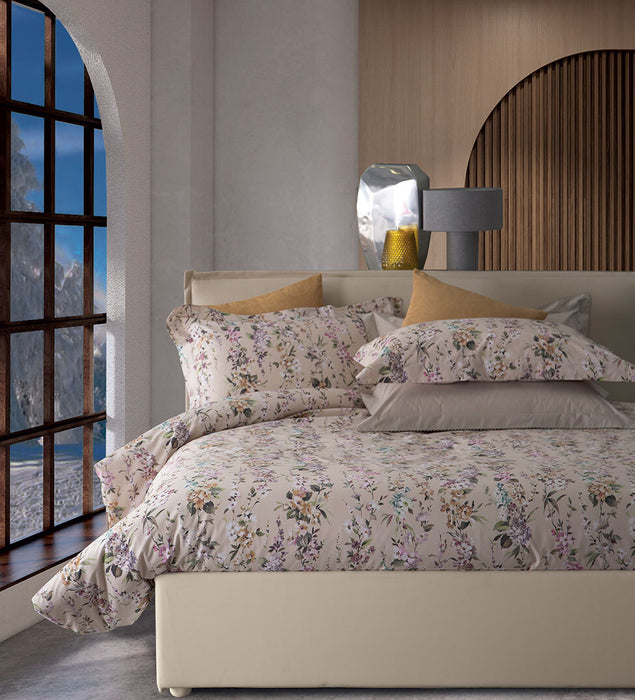 Completo copripiumino double face realizzato in percalle di cotone 200 T.C. La sacca e la federa a 2 volant sono stampati in digitale con motivi floreali, il sotto con angoli è in tinta unita. Vesti...