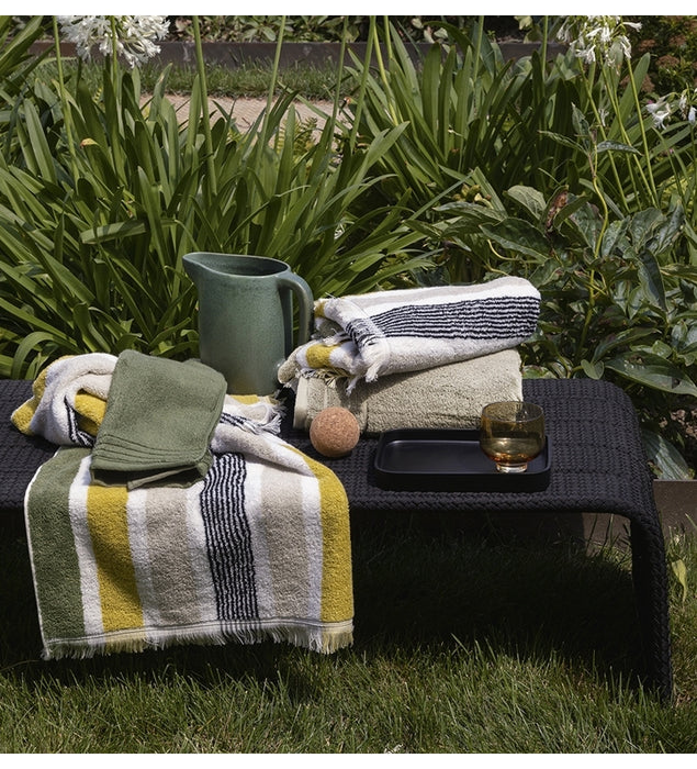 Realizzata in cotone di qualità tinto in filo, la spugna Gradazioni si aricchisce di nuovi colori per accostarsi alle differenti stagioni con il suo sempre attuale motivo a righe.Spugna 500gr/mq tinta in filo melange.Ospite 38x50...