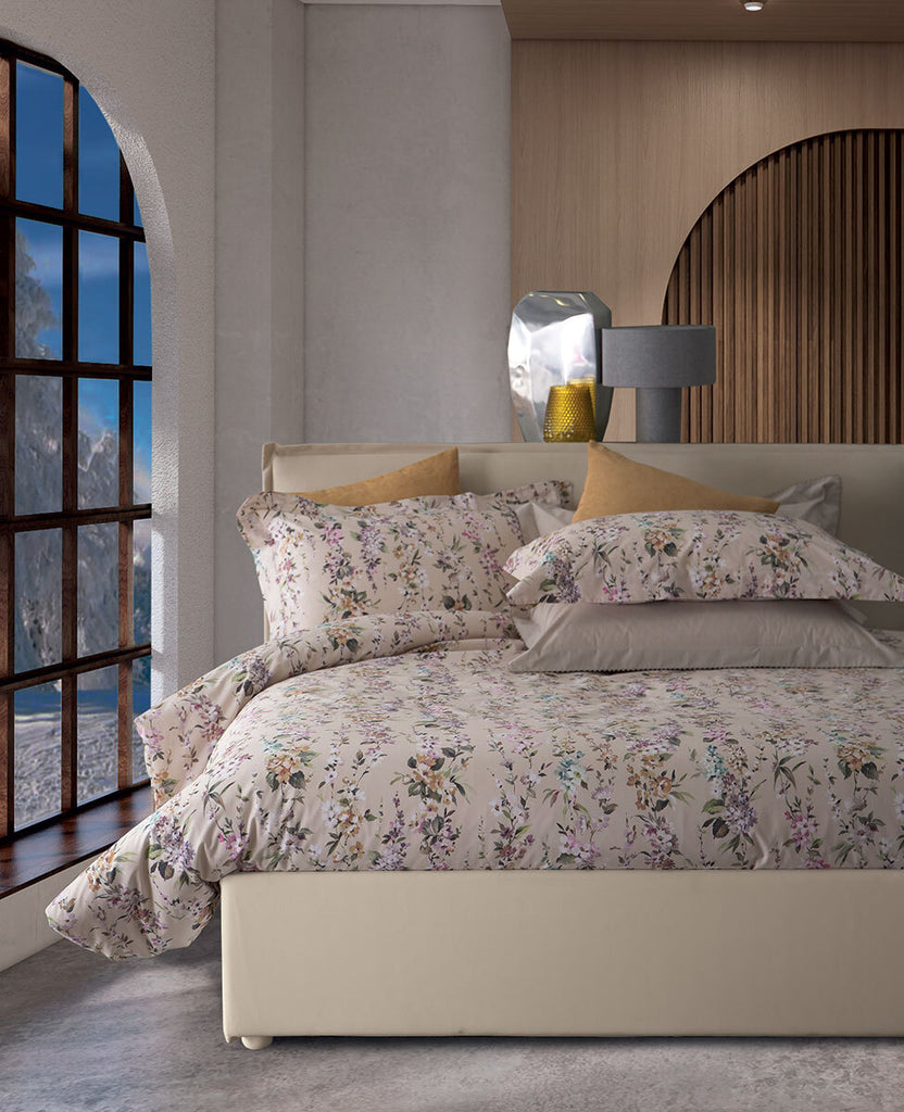 Parure copripiumino per letto singolo in percalle di cotone stampato con sottosacca in percalle tinta unita.Set 3 pezzi composto da: 1 sacca copripiumino 155x200 cm 1federe 50x80 cm a 3 volani da 6 cm Il...
