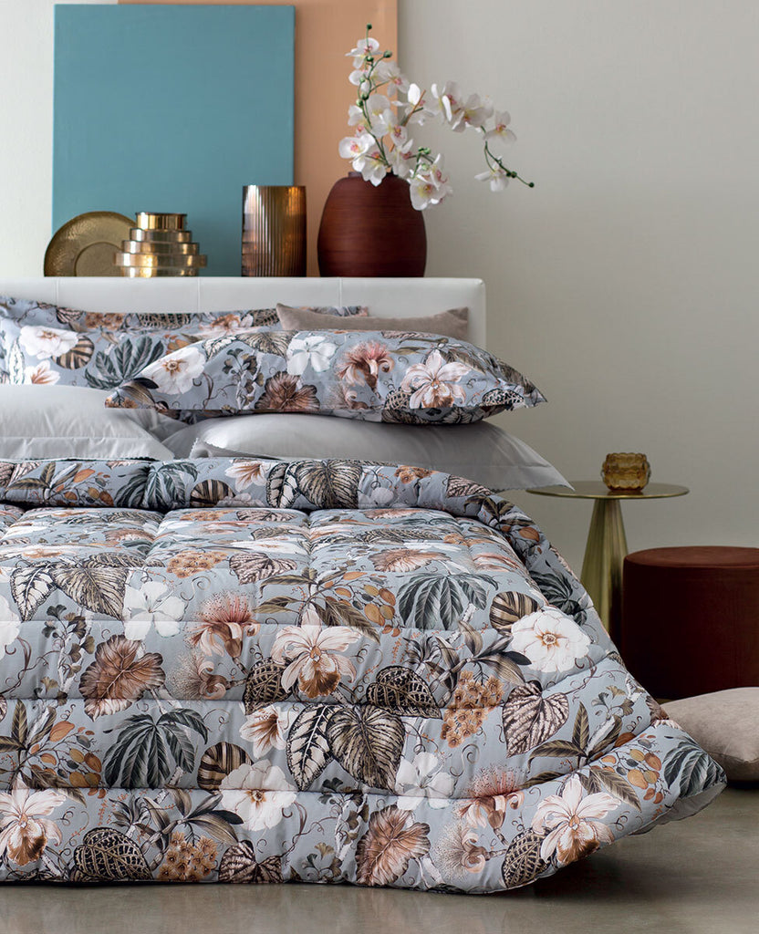 Trapunta matrimoniale in percalle di cotone stampato.Misure: 270x265 cmTessuto sopra: 100% percalle di cotone 200 TCTessuto sotto: 100% cotone tinta unitaImbottitura: 100% fibra di poliestere 340 g/mqMade in Italy