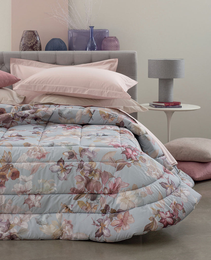 Trapunta per letto singolo in percalle stampato.Composizione tessuto: 100% percalle di cotone, 200 TCImbottitura: 100% fibra di poliestere - 340 g/mqTessuto sotto: 100% cotone tinta unitaMisura: 180x265 cmMade in Italy