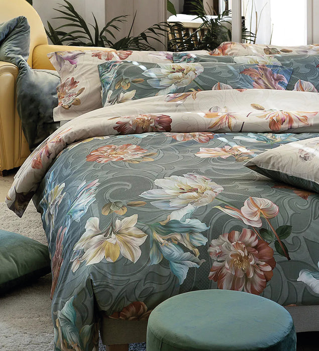 Completo copripiumino double face realizzato in percalle di cotone 200 T.C. La sacca e le federe a 2 volant sono stampati in digitale con motivi floreali, il sotto con angoli è in tinta unita. Vesti...