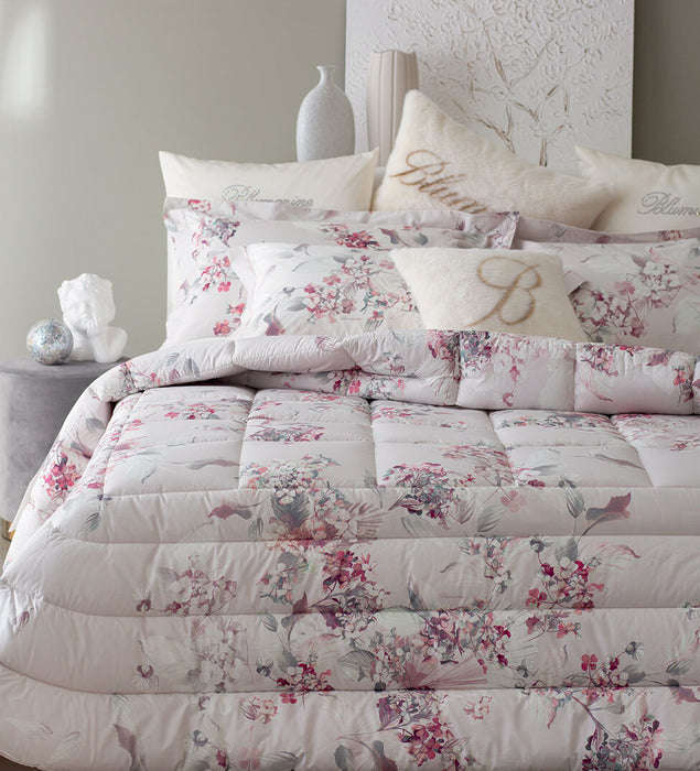 Trapunta matrimoniale con stampa all over su percalle di cotone con logo Blumarine stampato nella trama.Misure: 270x265 cmTessuto sopra: 100% percalle di cotone stampatoTessuto sotto: 100% cotoneImbottitura: 100% poliestere 340 g/mqMade in Italy
