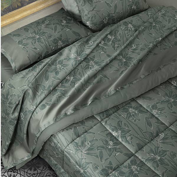 Completo Lenzuolo Victoria - Una stampa floreale tridimensionale con Victoria, il nuovo completo lenzuolo della Collezione Impero di Somma 1867. Tinto e stampato su raso mercerizzato da 120 fili/cmq, è composto da sottolenzuolo in raso...