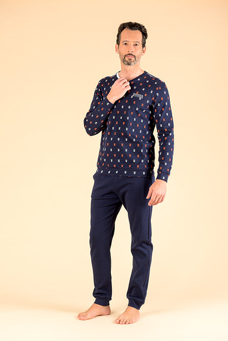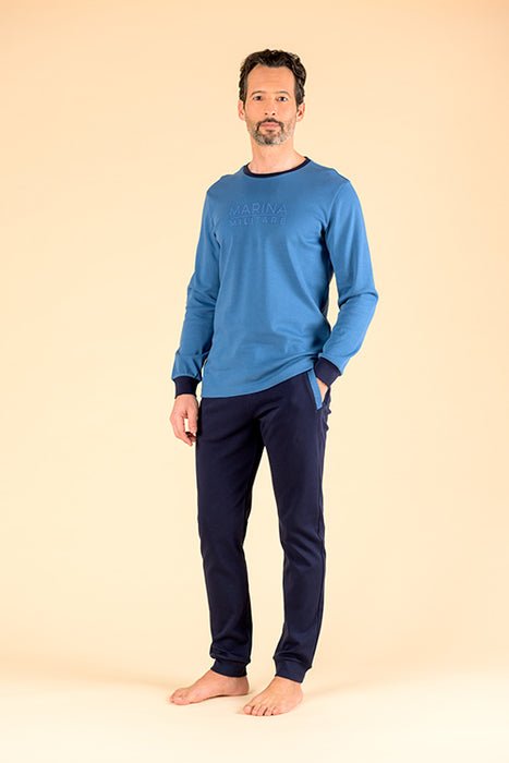 Pigiama realizzato in morbido punto milano garzato composto da maglia girocollo colore navy con stampa della scritta Marina Militare in tono colore e pantalone in tinto filo jacquard con fondo dritto. Composizione: 50%CO 50%PL.