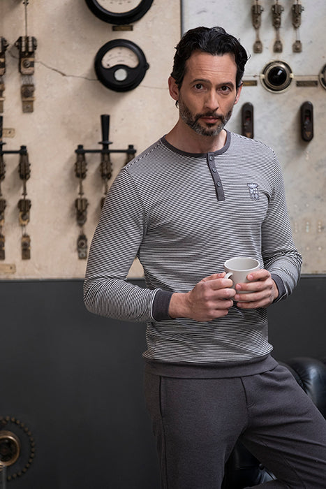 Pigiama da uomo in tessuto melange con collo serafino dal design particolare e scollatura con piccoli bottoni, ideale per un look rilassato ma sofisticato grazie anche al piping abbinato al pantalone. La stampa del logo...