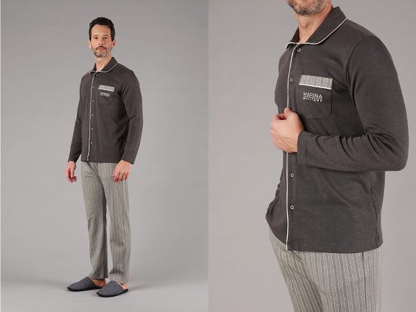 Piagiama uomo 100% Cotone manica lunga pantalone lungo, sopra aperto allacciatura con bottoni. Taglie S-M-L-XL Prodotto ufficiale Marina Militare