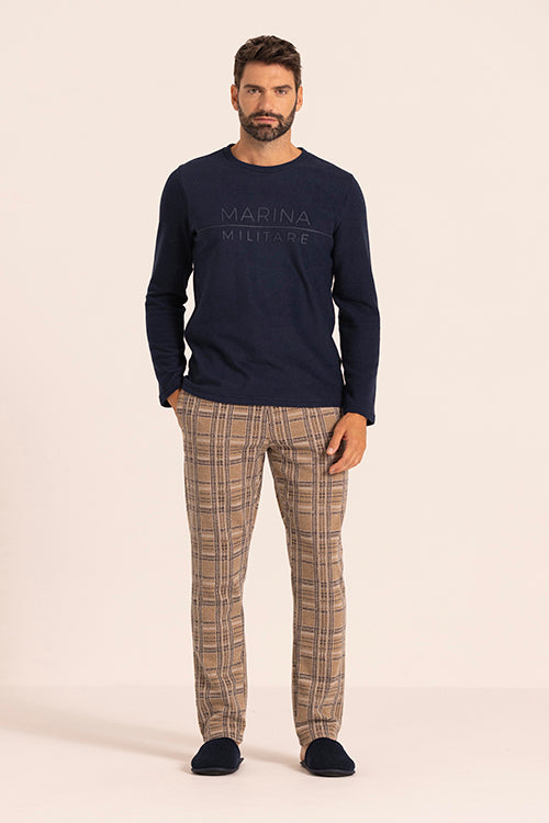 Pigiama realizzato in morbido punto milano garzato composto da maglia girocollo colore navy con stampa della scritta Marina Militare in tono colore e pantalone in tinto filo jacquard con fondo dritto. Composizione: 50%CO 50%PL.