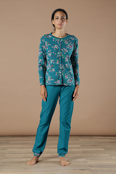 Pigiama in Interlock bicolore con giacca stampata all over con disegno a fiorellini abbinata a pantalone con polso in fantasia. L’apertura con bottoni rende questo completo funzionale e trasversale. Composizione: 100%CO.