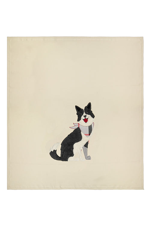 Morbido plaid in caldo pile con cane applicato i pelliccetta e pile stampato. Misura 160×180 cm. Composizione: 100%PL. Lavaggio: in macchina ciclo delicato.