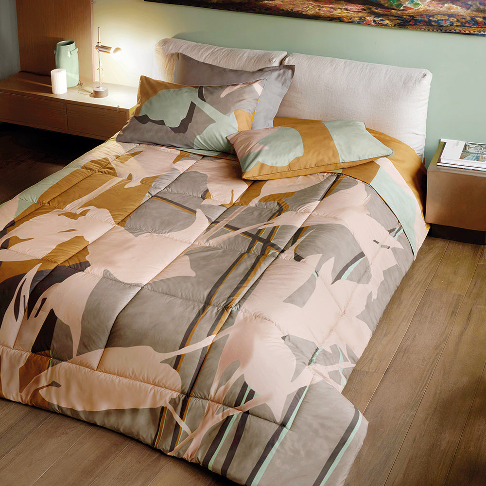 Anthos, la trapunta matrimoniale della Collezione Oscar di Somma 1867, realizzata su raso di puro cotone 120 fili cm/q con stampa digitale. Sopra stampa piazzata e retro tinta unita. Trapuntata a capo, a quadri con ribattitura.