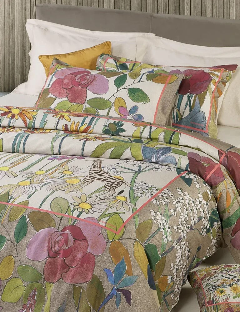 Completo copripiumino double-face in raso di puro cotone 300 T.C. La parte superiore della sacca e delle federe sono stampate con design personalizzato dall’iconica texture “OP” Occhio di Pernice; la parte inferiore della sacca e...