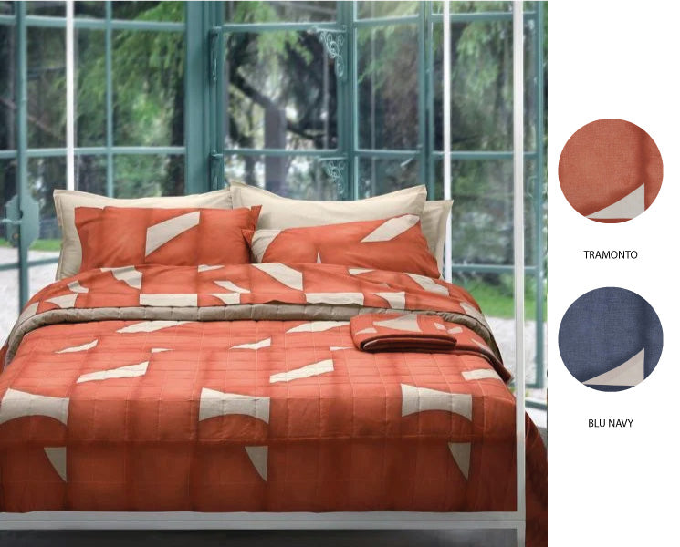 Parure Lenzuolo - Copriletto Yoko - Decise nuance si intrecciano a stili vivaci con Yoko, la parure lenzuolo-copriletto matrimoniale in fine percalle di puro cotone della Collezione Wonder di Somma 1867. Disponibile esclusivamente nella dimensione matrimoniale 270x290, è composto da lenzuolo stampato e coppia di federe stampate. Coordinabile con sottolenzuola in tinta unita Origami. Una collezione dalla personalità incredibilmente sofisticata e di carattere, con intrecci di carattere orientale e attenta alla sostenibilità, grazie ad un pack ecofriendly in tessuto riciclabile e riutilizzabile con chiusura a bottone. La scelta dei colori e delle rifiniture, la preziosità della texture unita alla carezza del percalle determinano la qualità superlativa di prodotti di biancheria per la casa unici firmati Somma 1867. Prodotto interamente in Italia e certificato Oeko-tex.