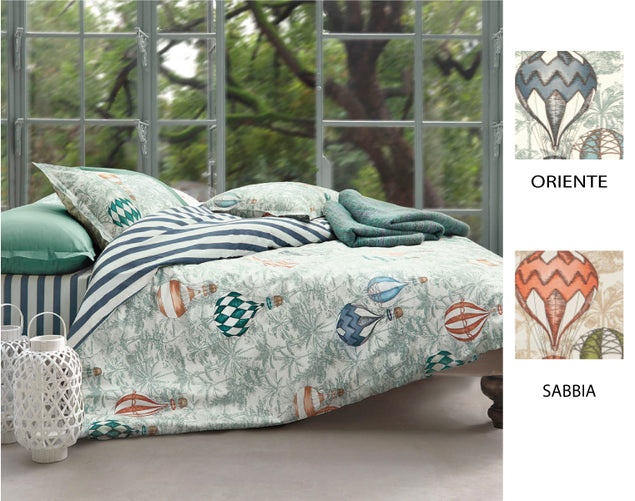 Completo letto matrimoniale realizzato su raso di puro cotone 120 fili cm/q con stampa digitale. Composto da lenzuolo tinta unita con balza applicata, coppia di federe con sopra stampa piazzata e retro in tinta unita rifinite...