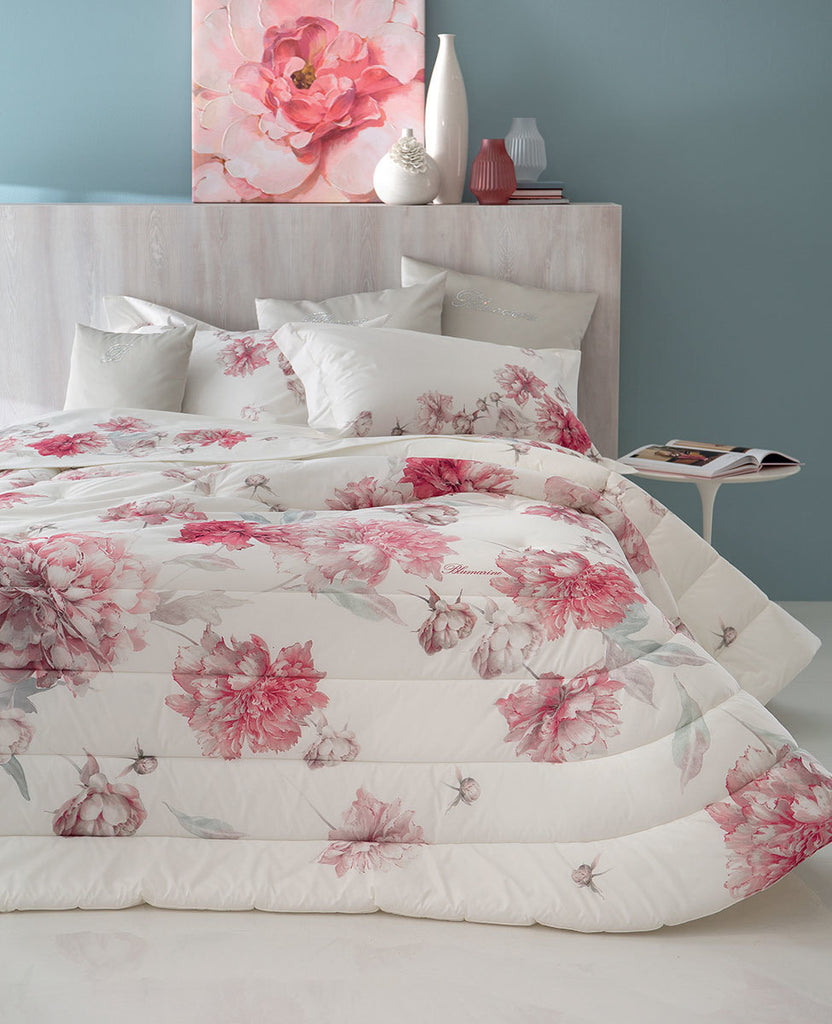 Trapunta matrimoniale con fresca stampa all over e logo Blumarine stampato nel tessuto. Misure: 270x265 cm Tessuto sopra: 100% percalle di cotone stampato all over Tessuto sotto: 100% cotone Imbottitura: 100% poliestere 340 g/mq Made...
