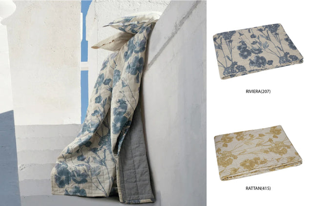 Copriletto trapuntato matrimoniale in misto lino e cotone, lavato a capo. double-face, sopra stampato e sotto falso unito. Realizzato a capo, 260x260 cm. imbottitura in morbida fibra anallergica di poliestere, peso 90 gr/mq.