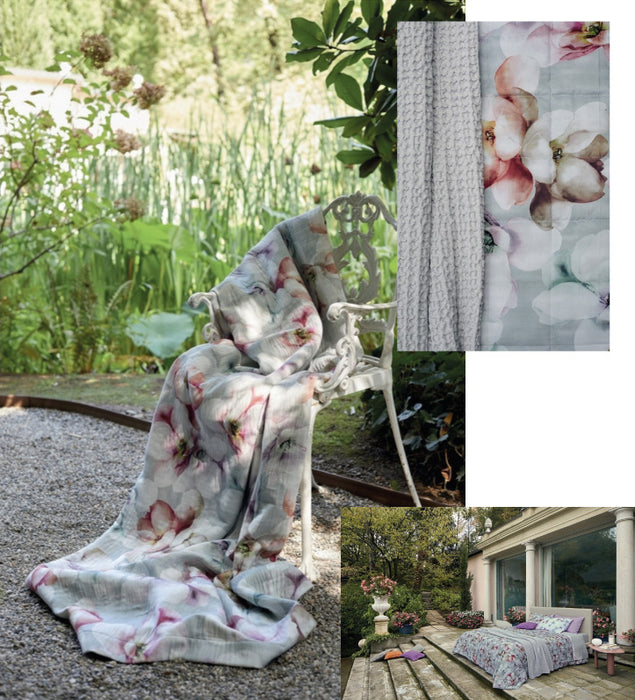 Preziosa stampa digitale. Percalle di puro cotone Trapuntato a capo, è rifinito a mano con due angoli sagomati 2 piazze: 270x270 cm Il giardino di Giverny che ha ispirato le più famose opere di MONET è...