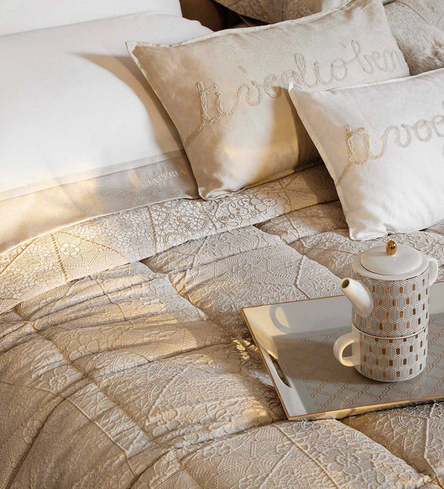 Trapunta matrimoniale in jacquard con logo tinto in filo nella trama del tessuto.Composizione:Tessuto sopra: 100% poliestere – jacquard tinto in filo con inserti di LurexTessuto sotto: 100% cotoneImbottitura: 100% poliestere 220 g/mqMade in Italy