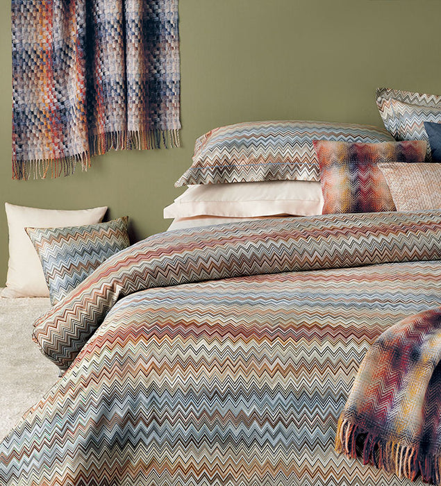 Sacco copripiumino in percalle di cotone, a macro chevron multicolori. 100 % cotone. Misura: sacco 255*200cm N. 2 federe 50*80 Confezione in busta MissoniHome. Composizione: 100% Cotone