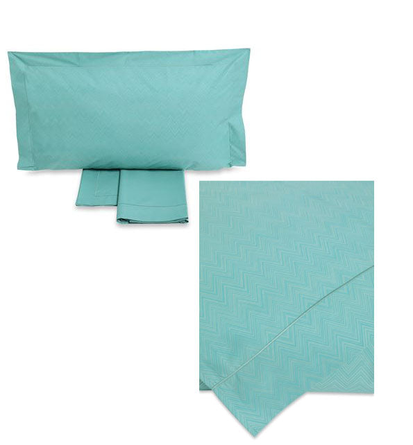 Set lenzuola in percalle di cotone motivo chevròn tono su tono. Composto da lenzuolo sopra 250x280 cm, coppia di federe 50x80 cm. Confezione in busta MissoniHome. Composizione: 100% Cotone
