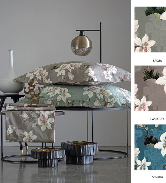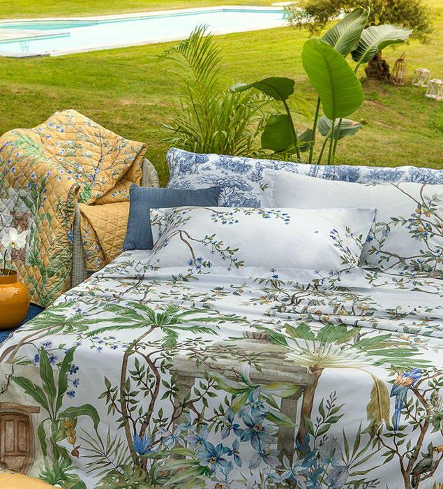 Completo copripiumino in percalle di puro cotone tinto e sovrastampato. Le federe pure tinte e sovrastampate sono impreziosite da un'importante balza di percalle tinta unita con un bordino applicato in doppio. Il lenzuolo con angoli...