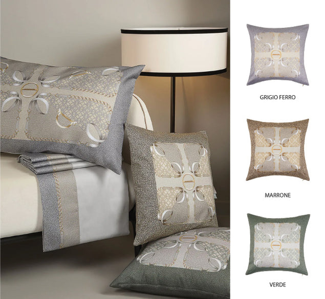 Cuscino arredo double-face in raso di puro cotone 300 T.C. La parte superiore è stampata con design personalizzato dall’iconica texture “OP” Occhio di Pernice; la parte inferiore con motivo “OP” coordinato. Confezionato con zip e...