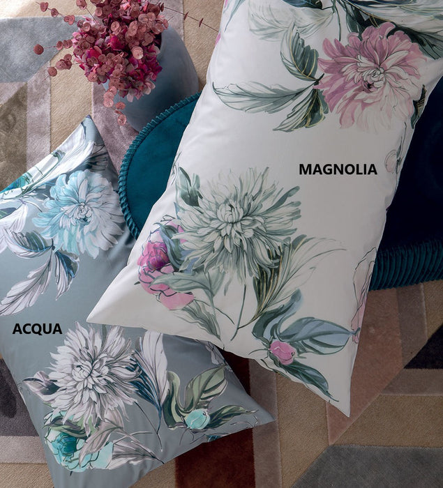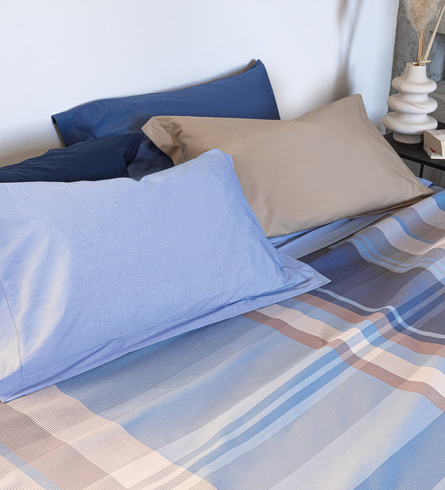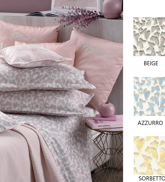 Completo lenzuola in raso di puro cotone 300 T.C in tinta unita con bordo applicato e federe a sacchetto stampato in digitale. Il lenzuolo sotto con angoli è in raso tinta unita. Confezionato in busta....