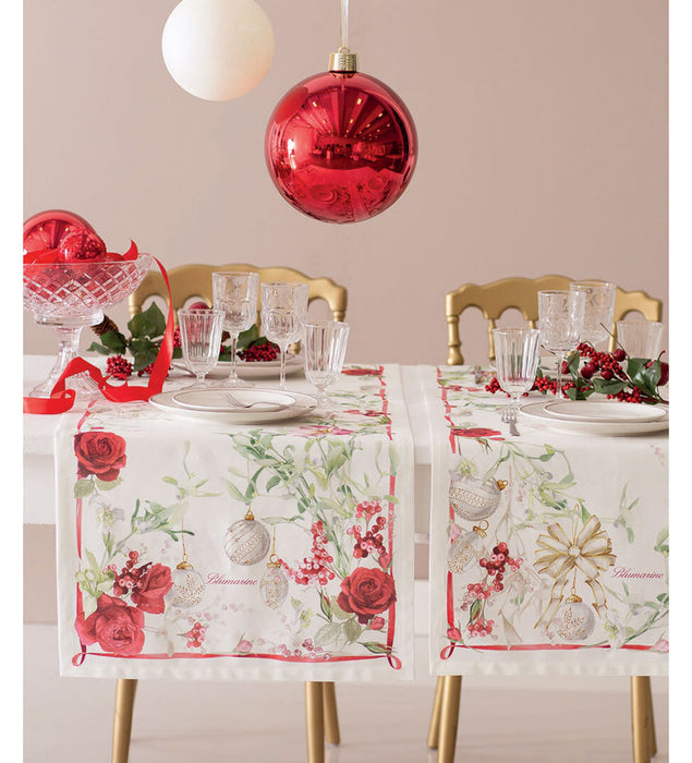 Runner in panama con stampa natalizia piazzata e logo Blumarine nella trama.Misure: 50x150 cmTessuto: 100% cotone Panama con trattamento antimacchiaMade in Italy