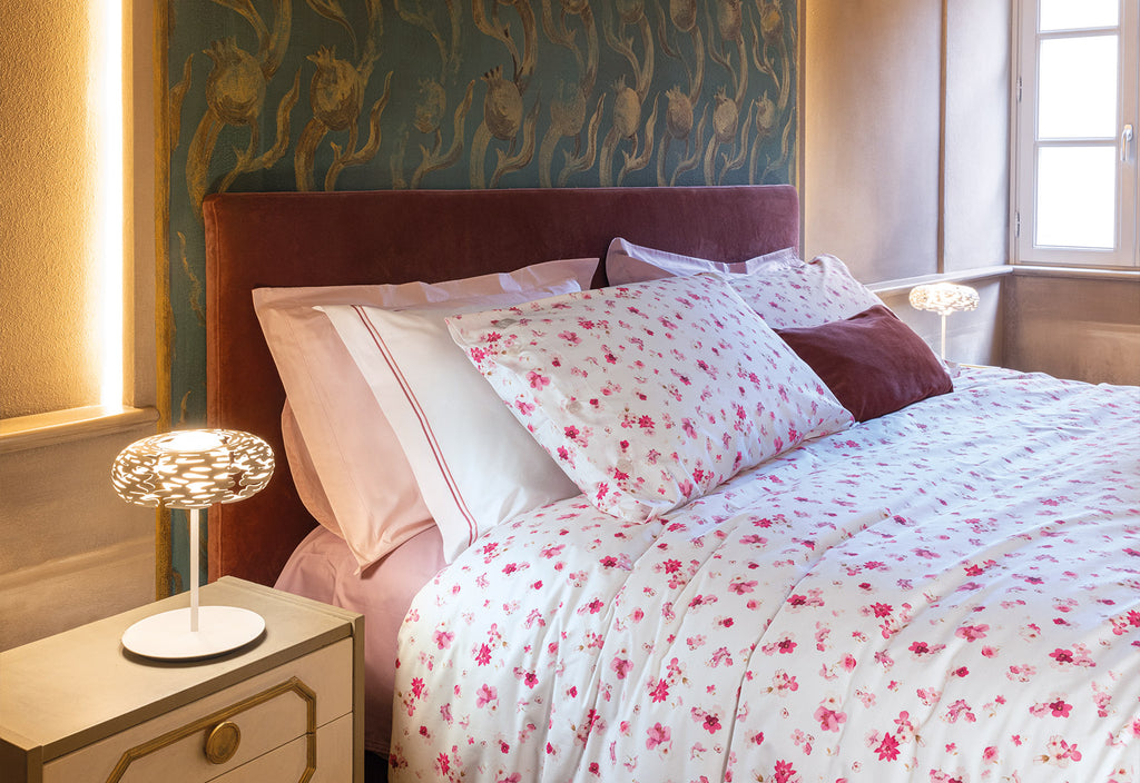 Completo letto inPercalle 80 fili 100% Cotone Pettinato effetto copriletto con balza rovesciataper avere sempre la stampa al dritto e poterla utilizzare come copriletto.Sotto con angoli tinto filo tessuto BossiMisura 255*290N. 2 Federe 50*80 con asole...