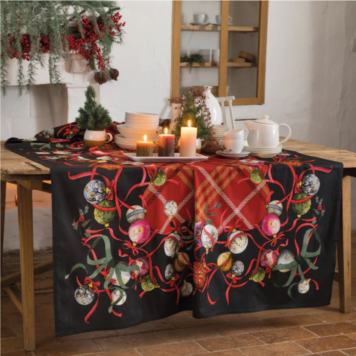 Centrotavola natalizio in cotone twill antimacchia, tessuto caratterizzato da un trattamento che rende il prodotto idrorepellente impedendo la penetrazione di liquidi o polvere e mantenendo inalterate le caratteristiche tattili e la morbidezza del tessuto.