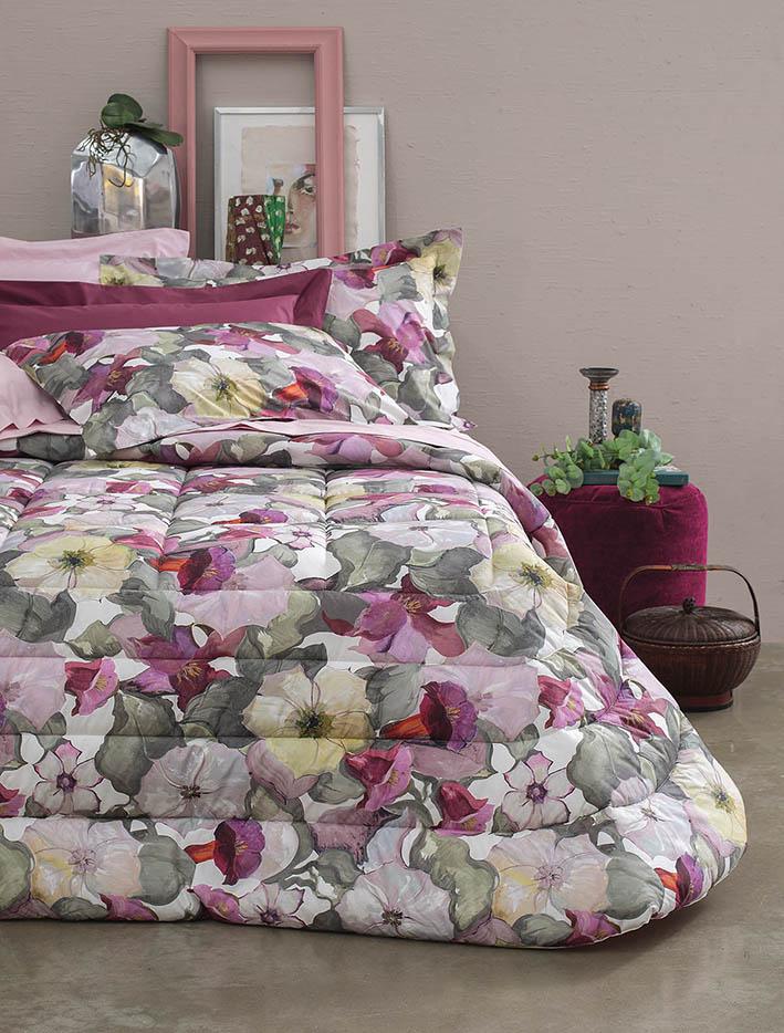Copriletto matrimoniale trapuntato in PERCALLE di cotone stampato con splendido motivo floreale. Misure: 270x270 cmTessuto: 100% percalle di cotone Imbottitura: 100% fibra di poliestere 90 g/mq Made in Italy