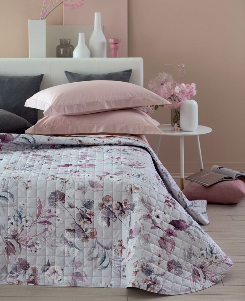 Fresco copriletto matrimoniale trapuntato in percalle di cotone stampato.Misure: 270x270 cmTessuto sopra: 100% percalle di cotone 200 TCTessuto sotto: 100% cotone tinta unitaImbottitura: 100% fibra di poliestere 90 g/mq