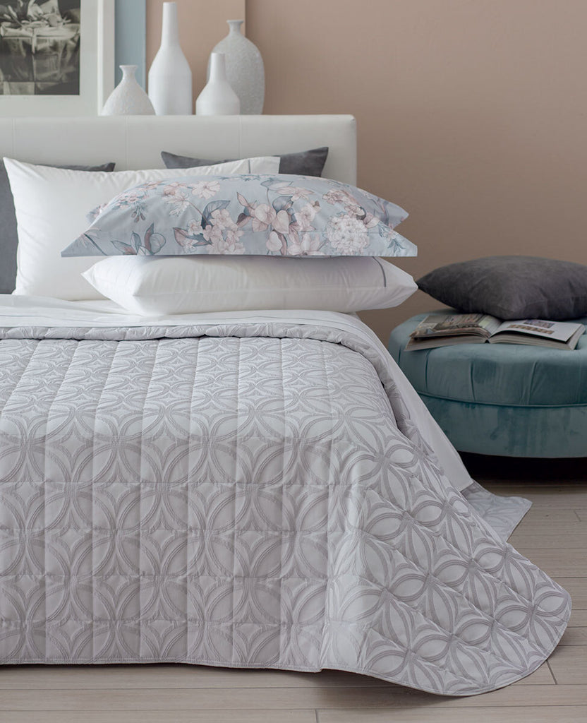 Elegante copriletto trapuntato matrimoniale con trama jacquard.Misure: 270x270 cmTessuto sopra: 100% poliestereTessuto sotto: 100% cotone tinta unitaImbottitura: 100% fibra di poliestere 90 g/mqMade in Italy