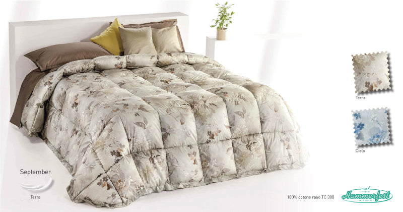 Trapunta in piumino d'oca a quadri fissi tessuto jacquard.Confezionamento: Trapuntatura a quadri chiusi e angoli ai piedi arrotondatiImbottitura: 90% piumino e 10% piumettaTessuto: Lato superiore:100% Raso di cotone 300 CT , Lato inferiore: 100% cotone...