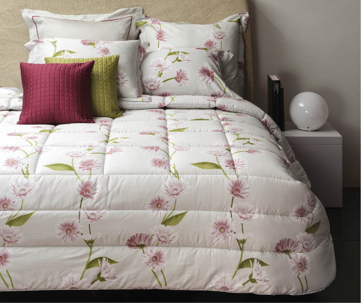 La trapunta Gerbera è interamente realizzata in Italia ed ha al suo interno uno strato soffice e caldo di poliestere.