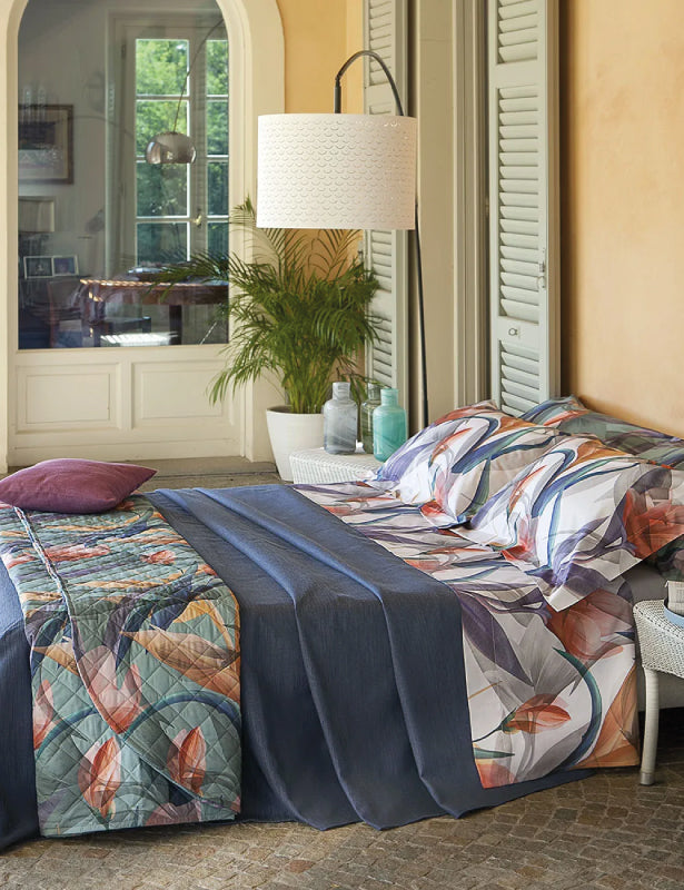 Trapunta realizzata in percalle di cotone 200 T.C. stampato in digitale con motivi floreali esaltati dalla trapuntatura a rombi e rifinita a mano con angoli stondati. Vesti la tua camera da letto con lo stile e la qualità inconfondibile di Tessitura Randi.