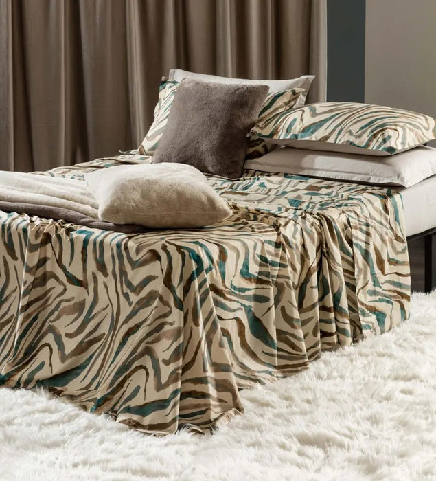 Completo lenzuolo copriletto in percalleUna reinterpretazione pittorica e astratta del manto di zebra, addolcito dalle pennellate e dall'uso del colore. Si abbandona il classico bianco e nero grafico per optare per sfumature dai toni innaturali...