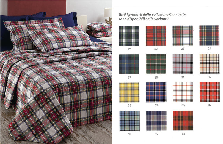 Trapuntino realizzato in percalle di cotone tinto filo 200 T.C. La trapuntatura piazzata esalta la fantasia scozzese. Rifinitura a mano con angoli stondati. Vesti la tua camera da letto con la collezione Clan di Tessitura...